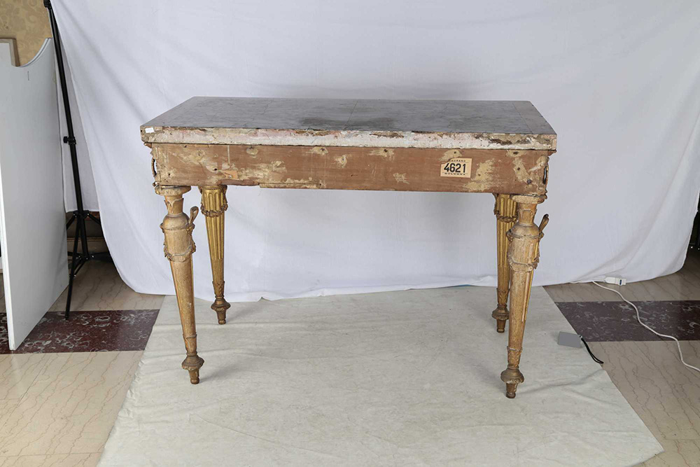 Console in legno intagliato e dorato; piano rettangolare lastronato in marmo...