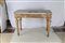 Console in legno intagliato e dorato; piano rettangolare lastronato in marmo pavonazzetto con ampia fascia perimetrale in cottanello, fascia delimitata da un nastro ritorto, percorsa da guilloché centrate da corolle in rilievo emergenti dal fondo dipinto di blu. Gambe rastremate scanalate ornate da rilievi vegetali in forma di foglia e di ghirlanda sorretta da nastri Italia centrale, fine del XVIII secolo, cm 100 x 133 x 66. Mancanze.
