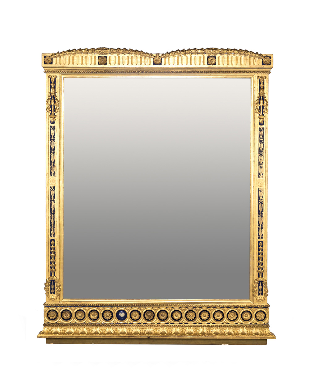 Specchiera in legno dorato e dipinto, "en suite" con la console descritta al lotto 132, di epoca successiva, cm 150 x 120