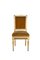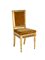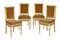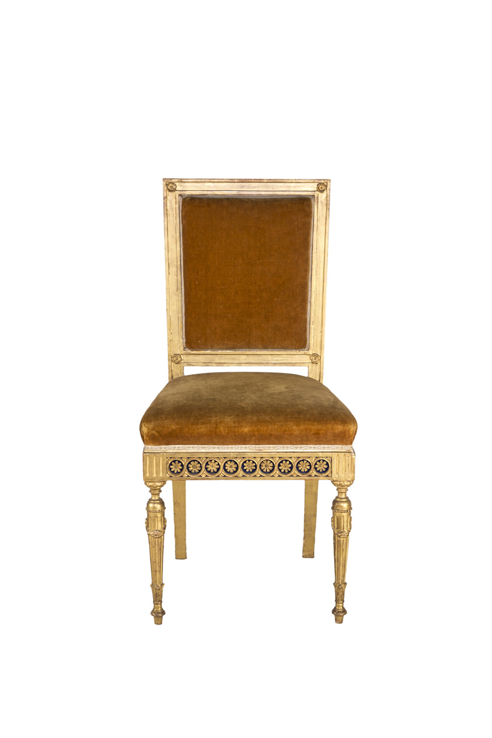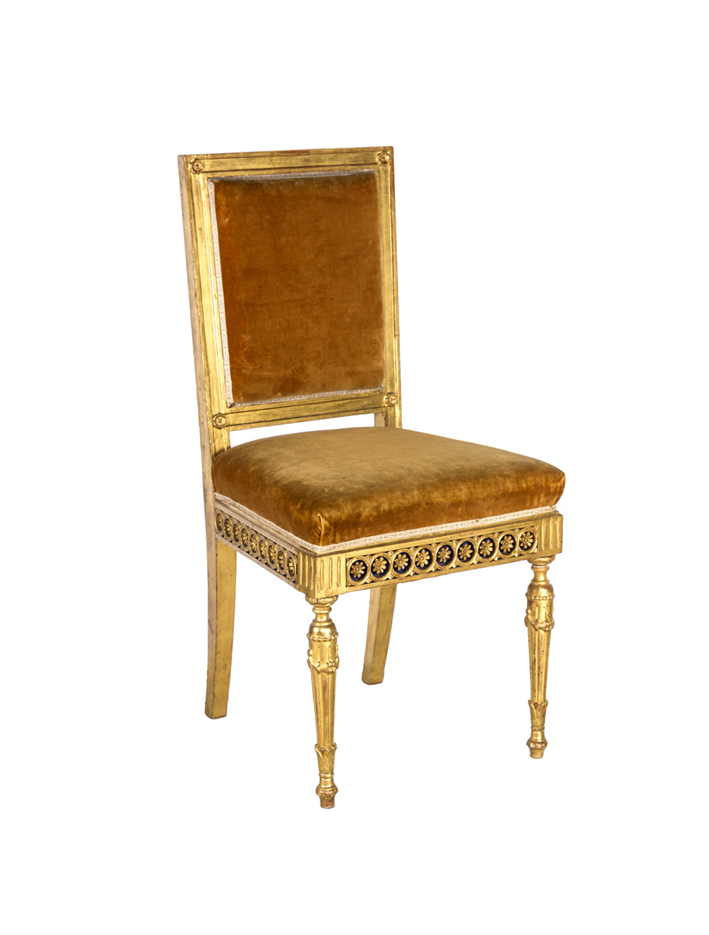 Quattro sedie in legno dorato, en suite con la console presentata al lotto 132; schienali squadrati e sedili imbottiti, fascia delimitata da triglifi angolari decorata da motivi circolari in sequenza dipinti in blu centrati da corolle intagliate; gambe rastremate, cm 100x50x50