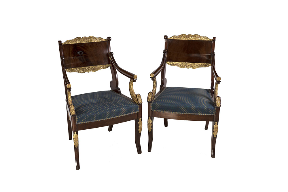 Coppia di poltrone in piuma di mogano, impreziosite da rilievi decorativi intagliati e dorati. Schienali a giorno con spalliera racchiusa da volute contrapposte, braccioli lineari sorretti da sostegni in forma di cornucopia, sedili imbottiti, gambe sagomate. Russia, XIX secolo, cm 94 x 70 x 50