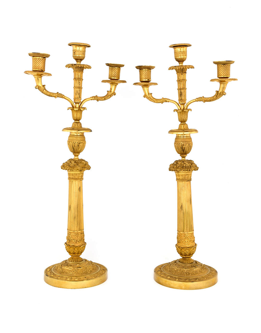 Coppia di candelabri in bronzo cesellato e dorato a doppio uso, con tre fiamme disposte sulla sommità di un reggicandela a forma di vaso; fusto scanalato, piede circolare, cm 51x25. Prima metà del XIX secolo
