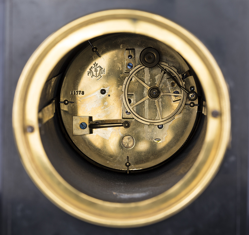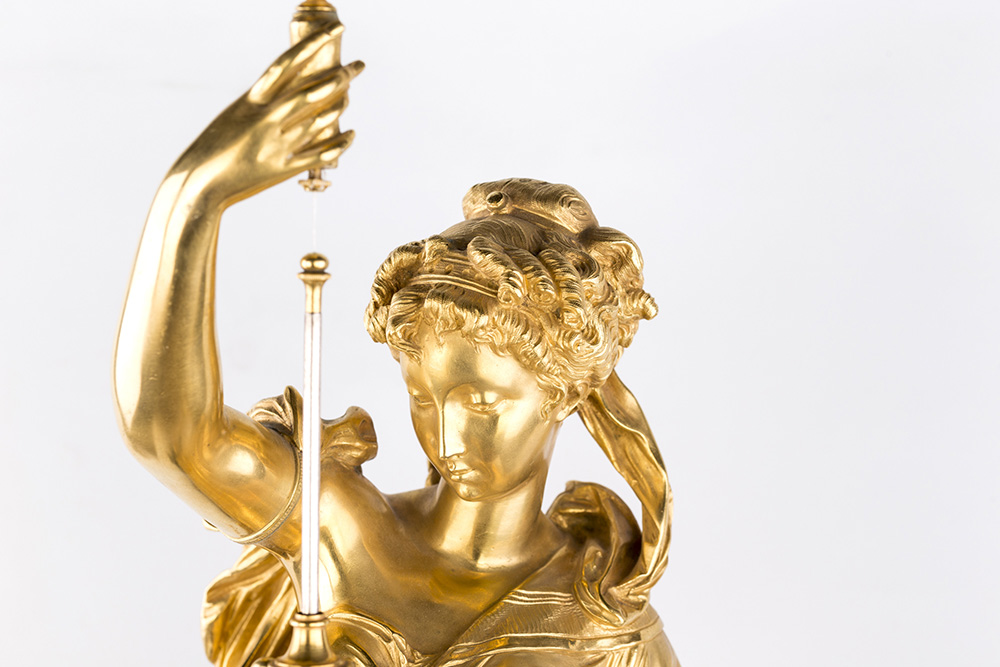 Grande orologio con pendolo conico, Francia circa 1870. Questo singolare e sontuoso orologio conico è sormontato dalla figura di Urania ideata dall'artista Albert-Ernest Carrier-Belleuse. La statua riprende una figura classica, che indossa vestiti finemente drappeggiati. Urania sorregge nella mano destra il pendolo laccato e dorato a formo di globo terrestre, sulla cui superficie sono rappresentati i continenti, mentre sull’equatore sono raffigurati, all'interno di una fascia, i sogni zodiacali argentati. Henri-Eugène-Adrien Farcot (Sainville 20 febbraio, 1830 - Saint-Maur-des-Fossés, 14 Marzo 1896) è stato un famoso orologiaio francese, le cui opere più celebri sono appunto gli orologi con meccanismo con pendolo conico. Nel 1853 fondò la Manifattura d'horlogerie E. Farcot con sede, dal 1855 (in precedenza in rue Vieille-du-Temple, 75, Parigi), in rue des Trois-Bornes, 39, Paris, nella quale lavorò fino al suo pensionamento alla fine del 1880. Nel corso della sua carriera, Eugène Farcot è stato premiato con una menzione d'onore e quattro medaglie nelle seguenti esposizioni: Besançon 1860 (bronzo), Londra 1862 (menzione d'onore), Parigi (1863 bronzo 1867 bronzo e 1878 argento), così come Henri Wandenberg, entrambi con una medaglia d'argento a Parigi 1889 e una medaglia d'oro a Parigi 1900. Oltre ad una notevole precisione delle meccaniche con pendolo conico, la caratteristica distintiva è il movimento circolare a velocità costante (invece che del convenzionale movimento oscillante) il pendolo, traccia una traiettoria conica nello spazio, da cui il nome. Gli orologi conici di Farcot si distinguono non solo per l'aspetto tecnico, ma anche per la loro eccellenza artistica, grazie alla collaborazione con artisti di fama, provenienti da diverse arti e mestieri, creando in tal modo un capolavoro nell'ambito delle arti decorative durante il secondo Impero. La base di marmo nero di Belgio dell'orologio, ha una piattaforma sagomata sulla quale poggia la figura di Urania ideata da Albert-Ernest Carrier-Belleuse. (12 giugno 1824 - 4 giugno 1887) è stato uno scultore francese, e uno dei membri fondatori della Société Nationale des Beaux-Arts, e nominato ufficiale della Legione d'Onore. La scultura, di eccezionale qualità, è in bronzo, cesellato e dorato. Questo aspetto è molto importante per posizionare l'orologio nella produzione di Farcot. Infatti, la fattura di questo statua, si distingue da orologi simili, apparsi all'incanto sul mercato internazionale, in cui la figura non è realizzata in bronzo, ma bensì in antimonio. Caratteristica Pendolo Conico La sua caratteristica principale è di ruotare circolarmente rispetto all'asse centrale, ed è in costante movimento rispetto al pendolo convenzionale. La prima menzione del pendolo conico appare nel racconto di Bodeker nel 1587 per l’orologio astronomico nel Dom a Osnaburg, successivamente esaminato e analizzato dal famoso matematico, astronomo e fisico olandese, Christiaan Huygens; tuttavia la sua prima applicazione pratica è stata di Passement a Parigi quando egli incorporò questo meccanismo in un orologio per tenere un cannocchiale puntato in modo continuo verso una particolare stella. Fu solo nel 1861 che Farcot impiegò per primo il pendolo conico per la sua commercializzazione, produzione che si distinse per l’elevata qualità. Movimento: scappamento libero con la parte superiore dell'orologio solidale con il pendolo. Suoneria a ore e mezza al passaggio su campanello. L'orologio è perfettamente funzionante. Misure cm 90x50x30