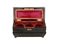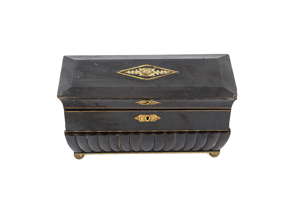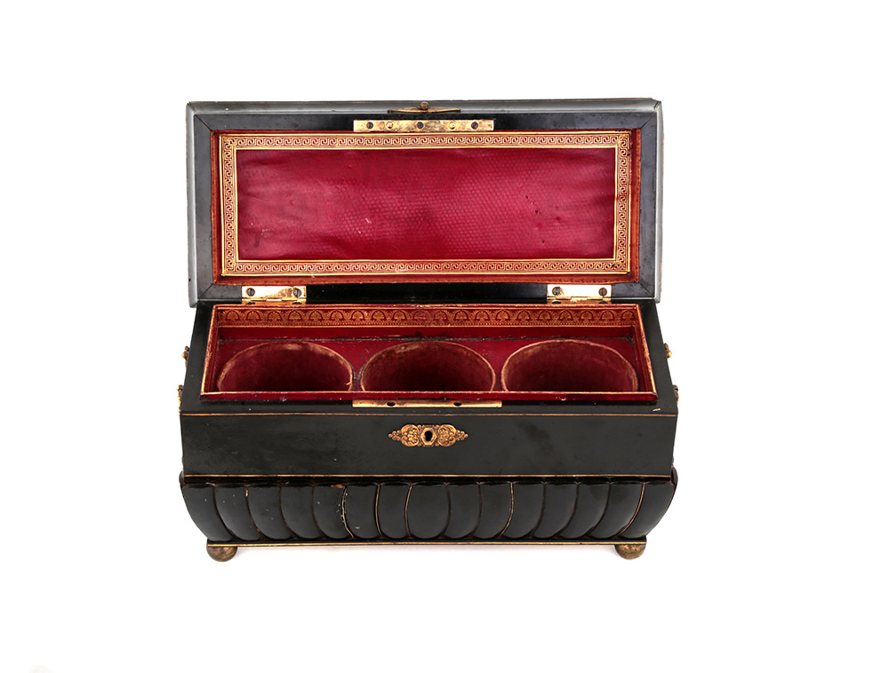Cofanetto rettangolare in legno ebanizzato, con coperchio incernierato abbellito da un fregio in bronzo dorato; parte inferiore doghettata, maniglie laterali in bronzo, piedi a sfera. L'interno è rivestito in cuoio rosso ed ospita tre scomparti cilindrici. XIX secolo, cm 20x37x16