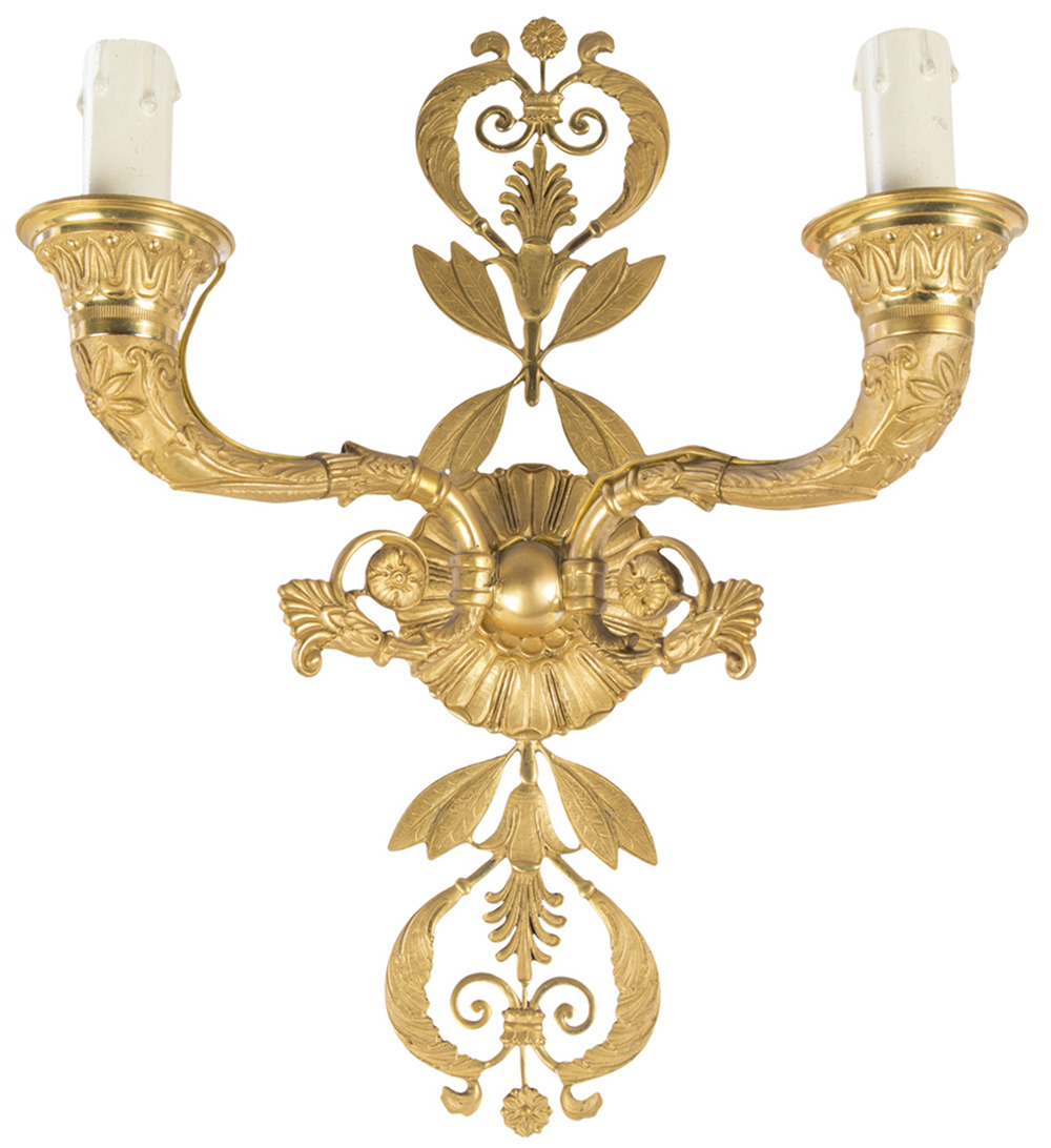 Quattro appliques a due fiamme in bronzo dorato, Francia fine XIX secolo. Misure: cm 38x27