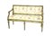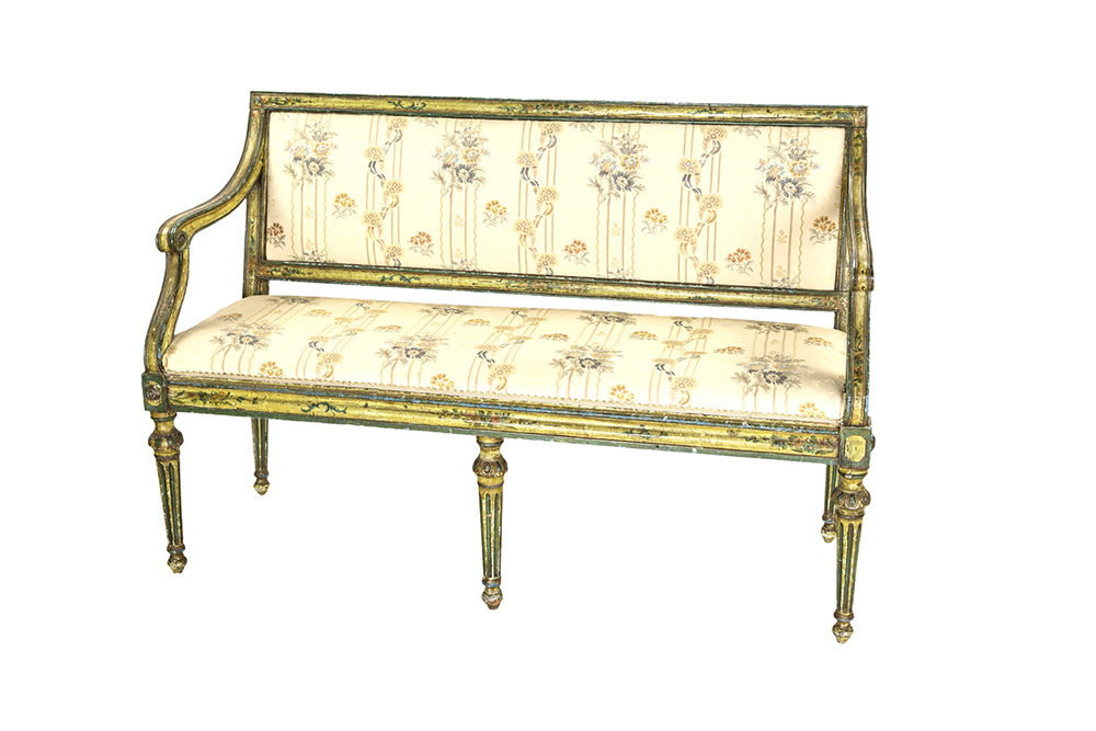 Divano in legno laccato in due tonalità di verde pastello, con cornici lineari abbellite da tralci fioriti; schienale e sedile imbottiti, braccioli lineari, gambe rastremate scanalate. Fine del XVIII secolo, cm 88x130x45