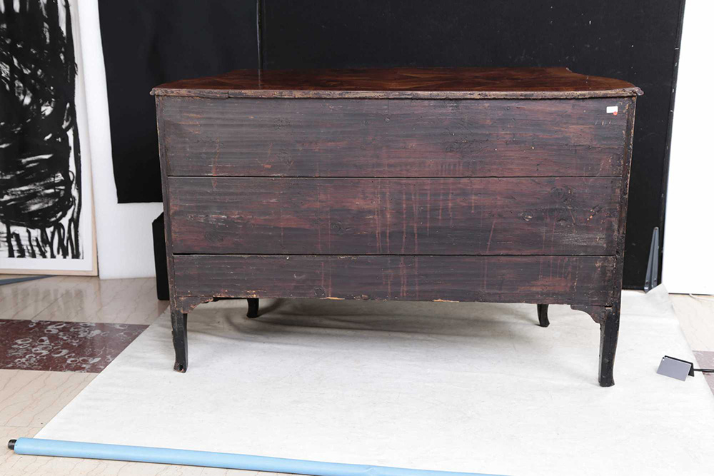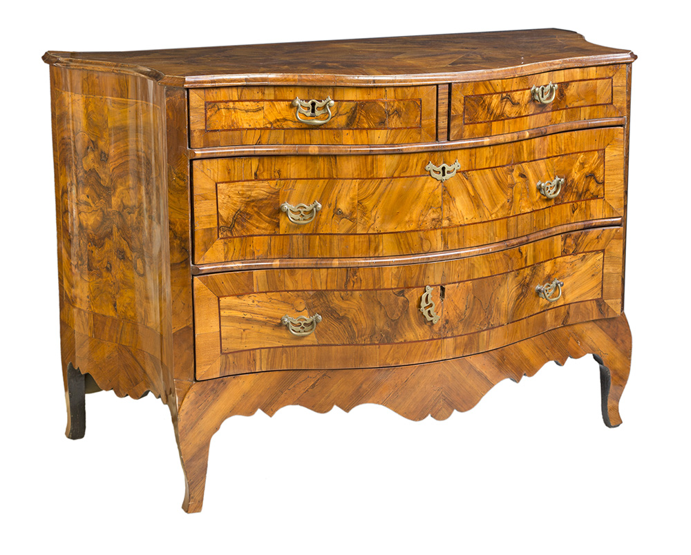 Cassettone impiallacciato in radica di noce; corpo sagomato con pannelli racchiusi da filettature, due cassetti allineati e due sottostanti con bocchette e maniglie in bronzo, grembiule mistilineo, piedi sagomati. Italia XVIII secolo, cm 85x130x55, Restauri e sostituzioni.