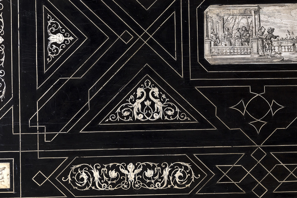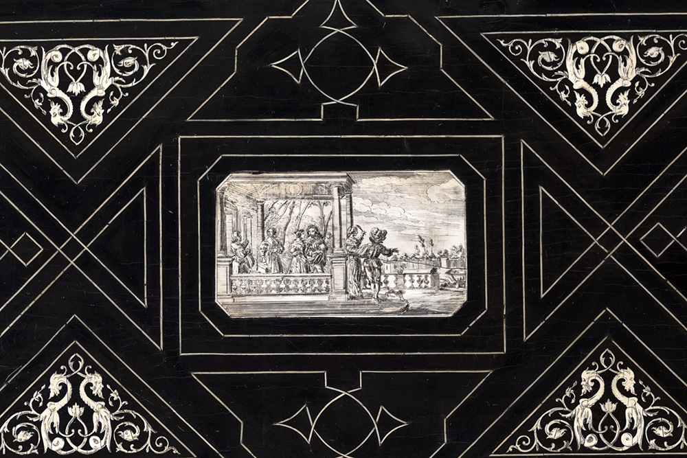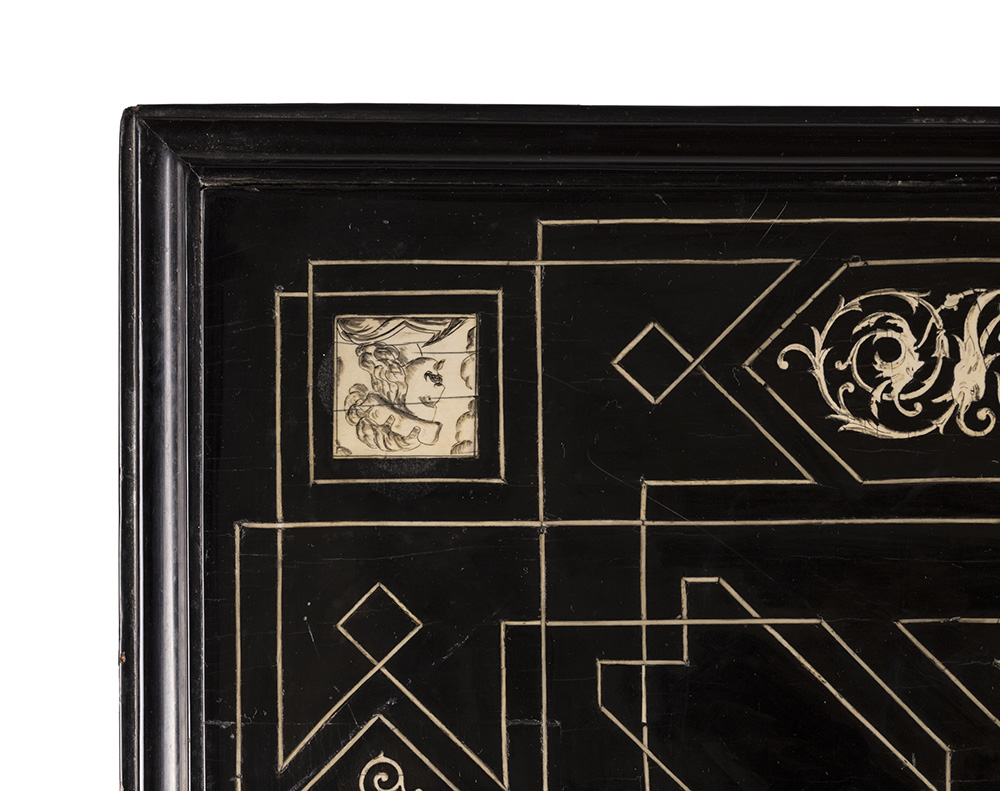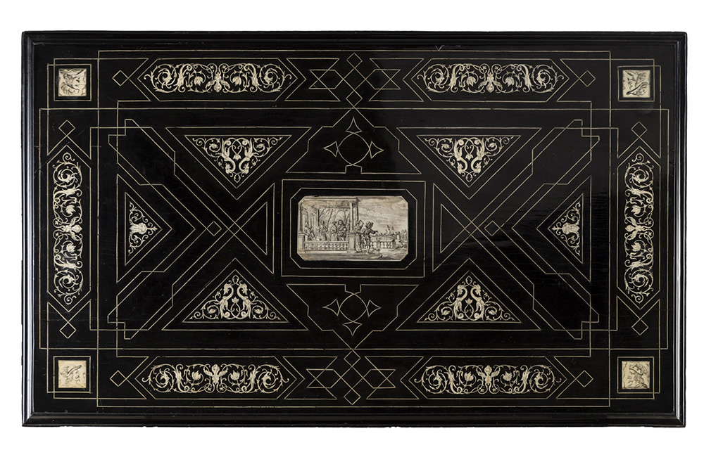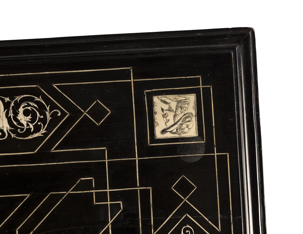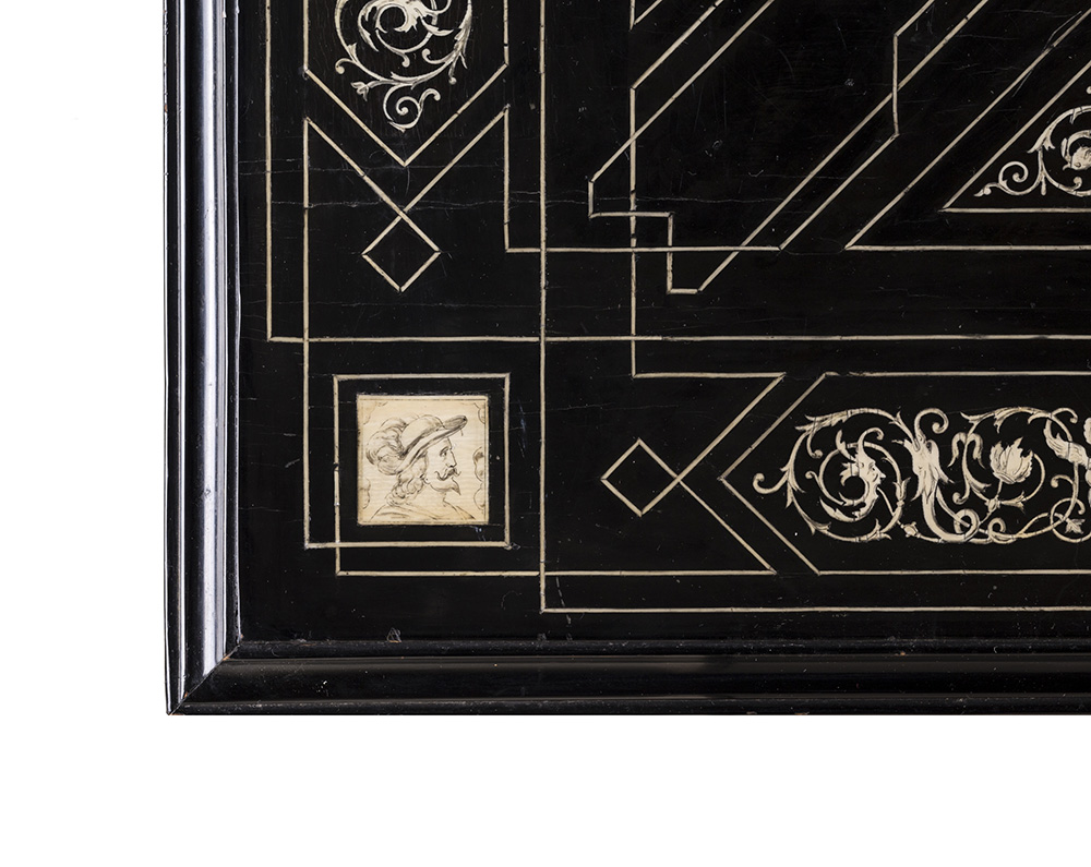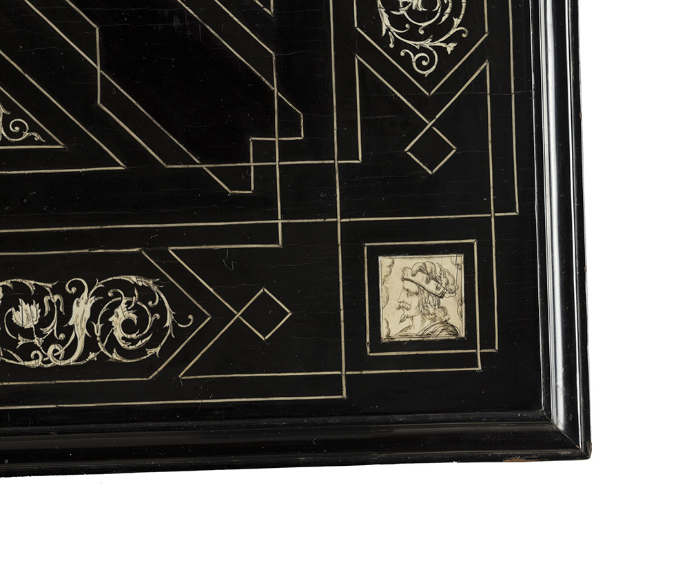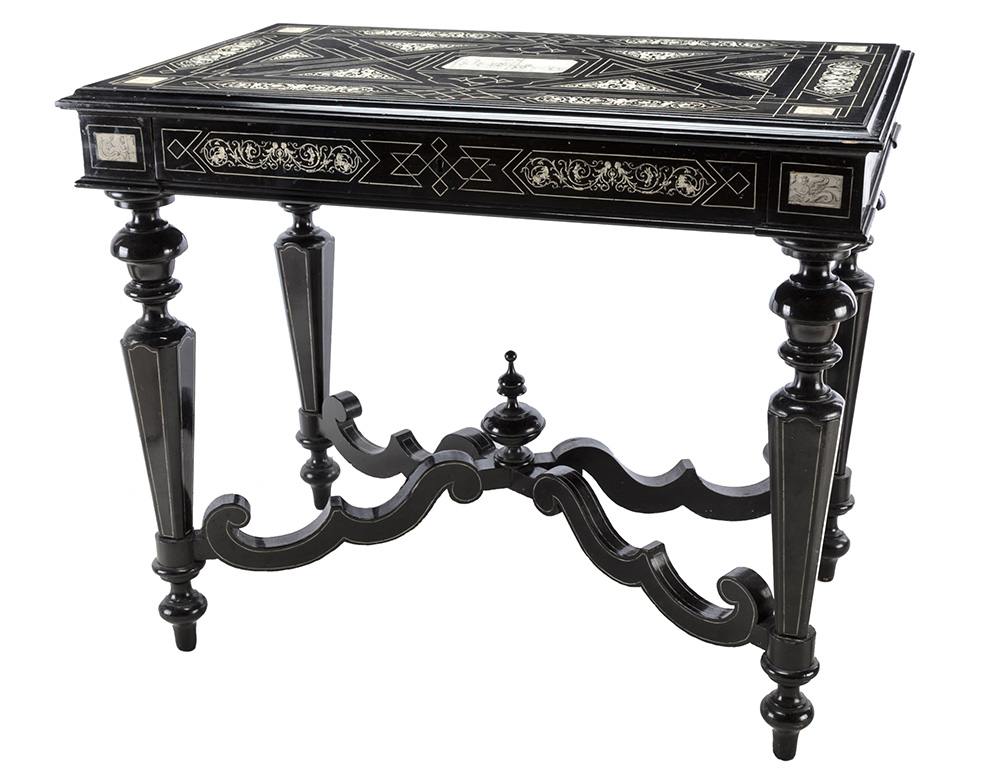 Tavolo rettangolare in legno ebanizzato interamente decorato ad intarsio in avorio in forma di filettature a creare motivi geometrici, grottesche e profili virili angolari; al centro del piano una formella con decorazione pirografata raffigurante personaggi sotto una loggia. Un cassetto compreso nella fascia, gambe rastremate riunite da traversa a crociera sormontata da un pinnacolo. XIX secolo, cm 80x100x60