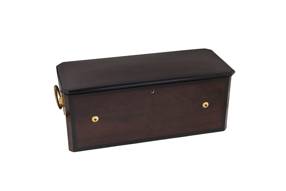 La produzione di carillon di johann Heinrich Heller (1830-1906) fu avviata prima del 1860. Questo carillon dispone di 8 differenti arie indicate nella lista dell’epoca scritta a mano. Oltre all'etichetta originale in carta, sul carillon la firma "JH Heller" è stampigliata sul telaio che governa la velocità attraverso le palette (J.H. HELLER). La cassa è in eccellenti condizioni, è impiallacciata in legno di mogano, ai lati del mobile sono presenti due maniglie in bronzo cesellato e dorate, cm 24x72x27