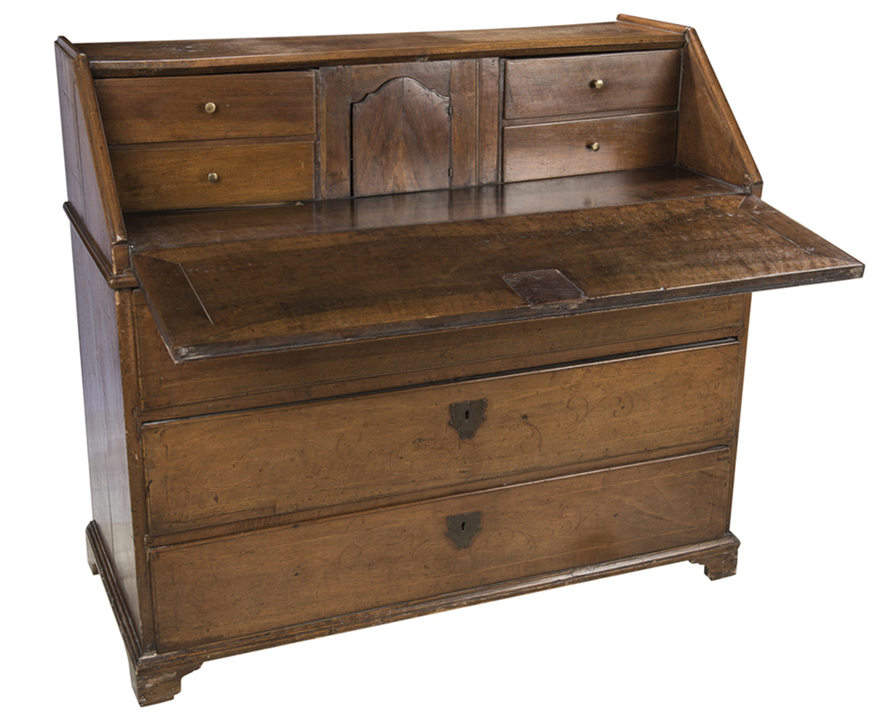 Ribalta in legno di noce filetto ornato in legno di ciliegio, scarabattolo a quattro cassettini e sportello centrale, tre cassetti sul fronte, piedi a mensola. Misure: cm 110 x120x55 Difetti