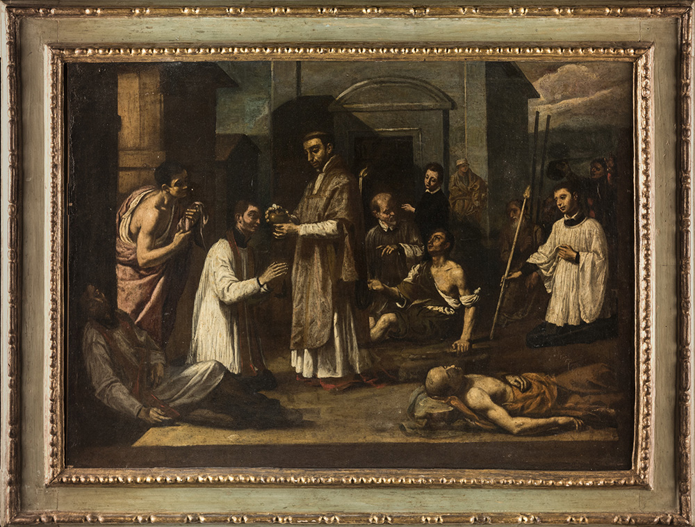 S. Carlo Borromeo comunica con gli appestati, cornice coeva in legno intagliato e laccato, olio su tela cm 63.5x87