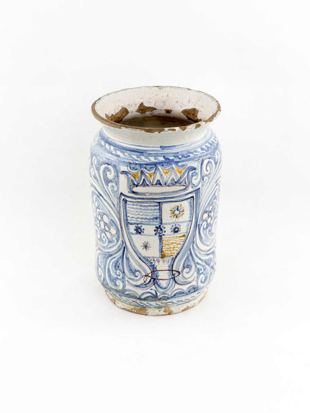 Albarello in maiolica bianca e blu con stemma nobiliare fine XVII inizi XVIII secolo