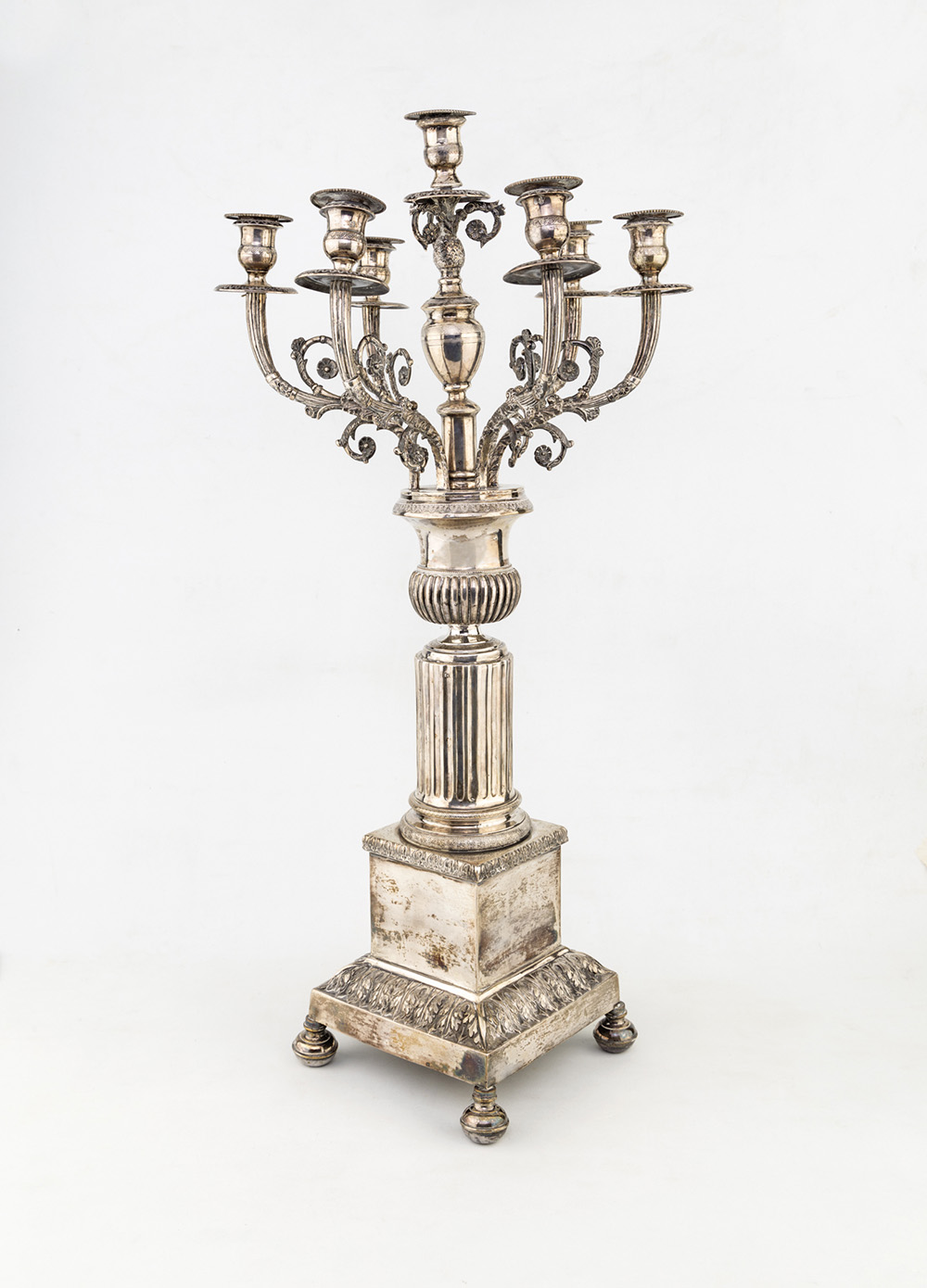 Candelabro in argento a sette luci che si dipartono da un supporto a forma di vaso a cratere posto sulla sommità di un rocchio di colonna scanalato; bracci arcuati sottolineati da rilievi vegetali, piedistallo quadrangolare su base con palmette cesellate poggiante su piedi a sfera. Altezza cm 60, g 2.522