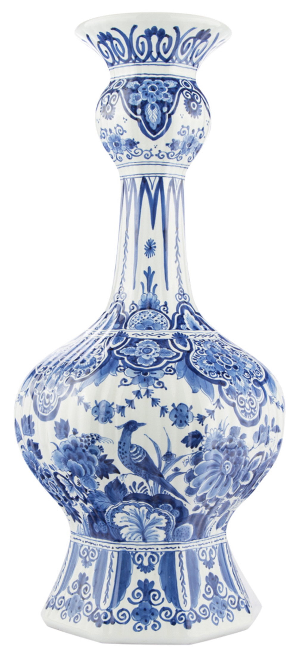 Grande vaso in porcellana dipinta bianco e blu, decorato a motivi floreali. Manifattura Delft XX secolo. Altezza cm 58