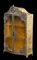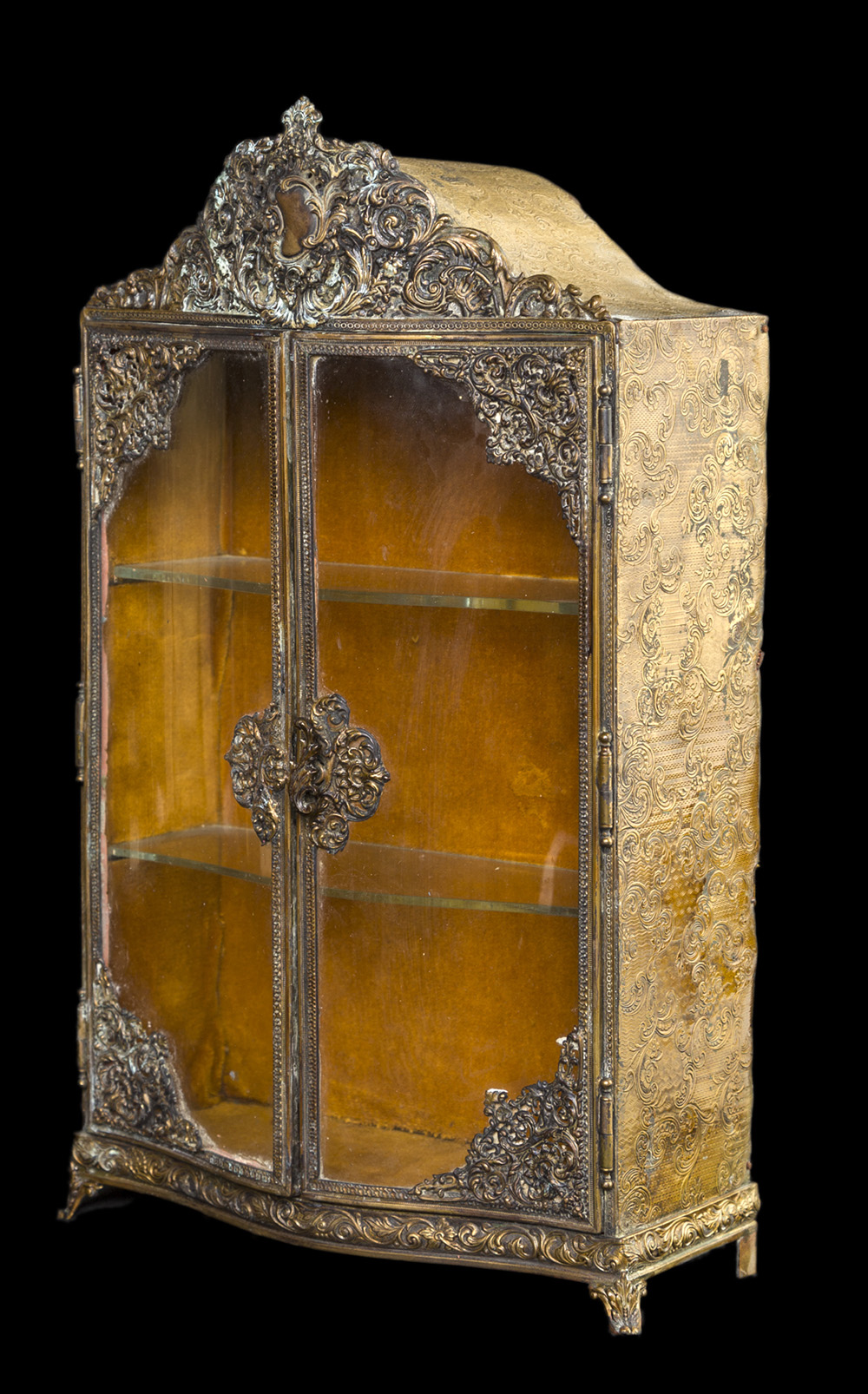 Modello di vetrina d'epoca Liberty in metallo sbalzato, con fitta decorazione a volute e cartigli posta sulla sommità e agli angoli, cm 39x20x10
