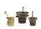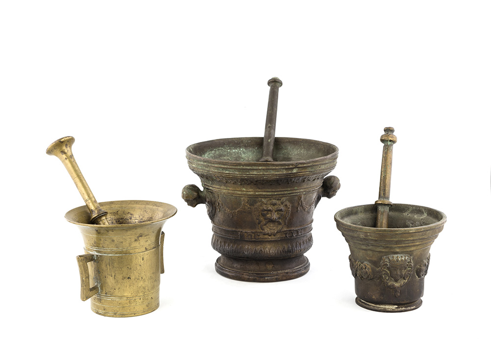 Tre antichi mortai in bronzo con pestello: il primo di forma cilindrica e bocca svasata con manici squadrati; il secondo datato 1630, con più ordini di decorazione stilizzata, volto di satiro affiancato da festoni ed anse a testa muliebre; il terzo con volto di regnante affiancato da cartigli. Misure diverse.