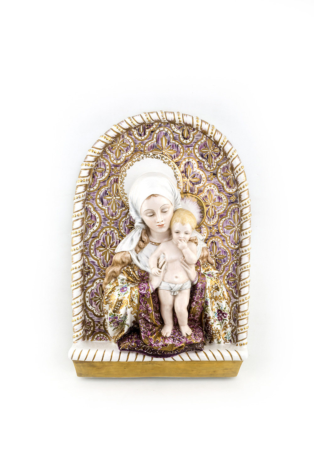 Placca in maiolica policroma raffigurante Madonna col Bambino, cm 45x30x10,...