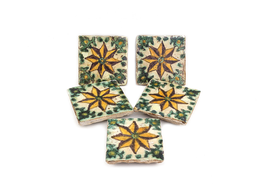 Lotto di cinque mattonelle in maiolica dipinta XVII secolo Burgio Sicilia