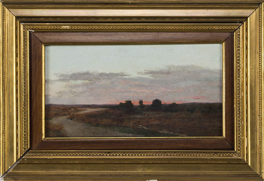 Paesaggio fluviale al tramonto, Olio su tavola, cm 17x32