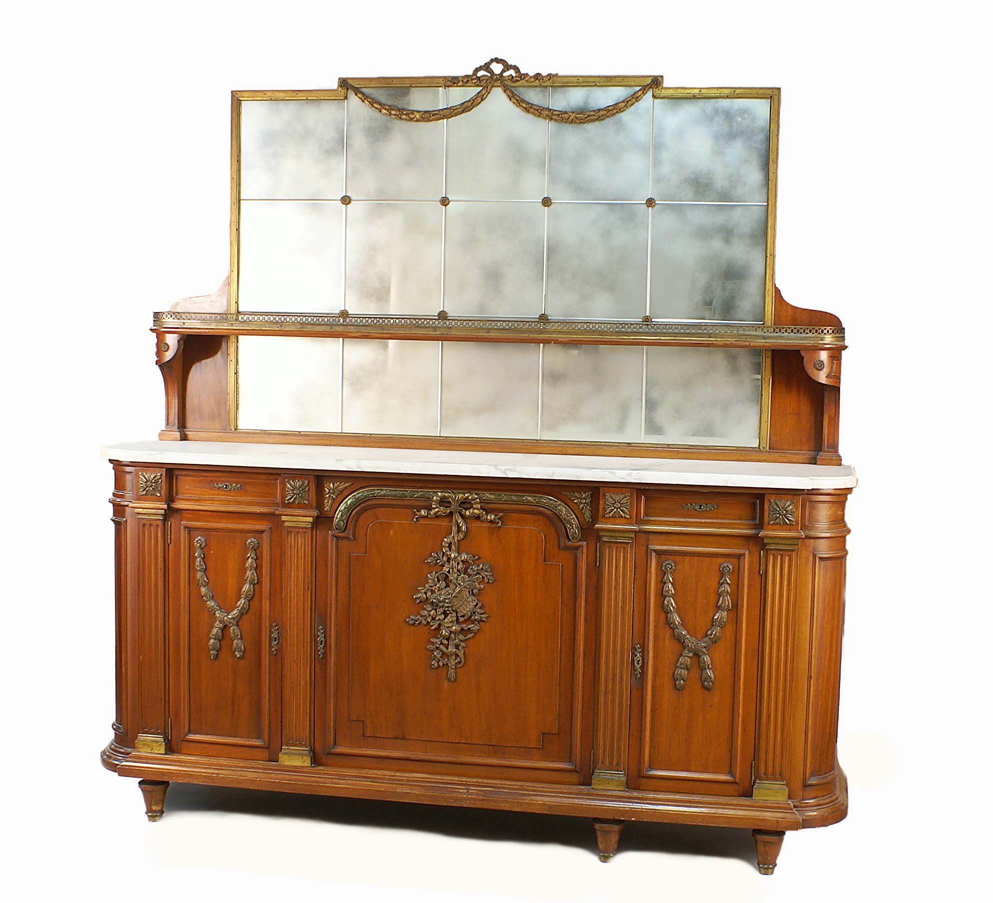 Credenza con relativa specchiera in mogano e ricche applicazioni in bronzo dorato, piano sagomato in marmo bianco di Carrara, fronte a due cassetti e tre sportelli, Francia inizio del XX secolo, cm. 232x234x57.