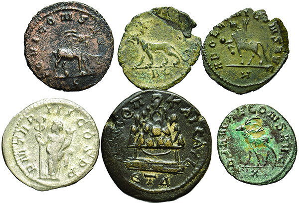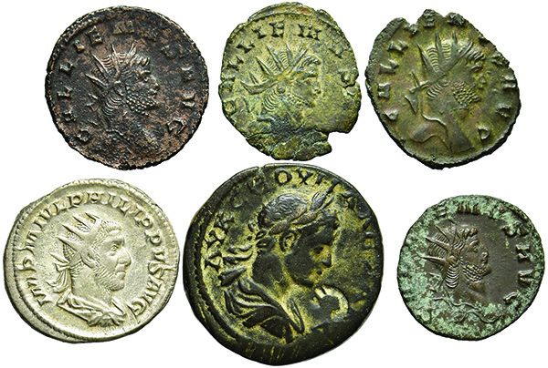 Lotto di 6 monete: un antoniniano in argento di Filippo I, una moneta in bronzo di Alessandro Severo per Cesarea di Cappadocia con contromarca, e 4 antoniniani in mistura di Gallieno