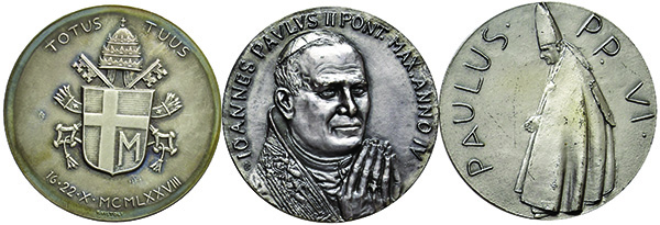 ROMA. Tre medaglie papali in argento, una di Paolo VI 1977, e due di Giovanni Paolo II, anni I e IV. In astucci