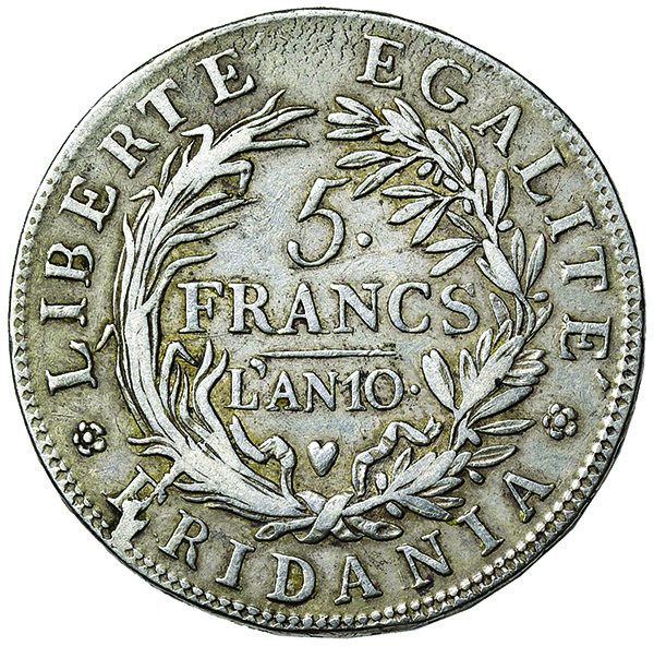 TORINO. Repubblica Subalpina (1800-1802). 5 franchi l'anno 10. Pagani 6. AG. Rara. MB/BB
