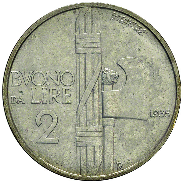 REGNO D'ITALIA. Vittorio Emanuele III (1900-1946). Buono da lire due 1935. Pagani 753. Coniata in 50 esemplari. NI. Rarissima. Sigillata Negrini FDC