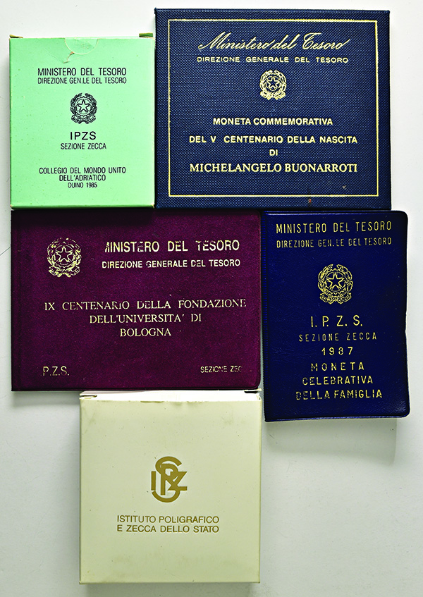 Scatola contenente 18 monete da 500 lire commemorative in astucci, più due da 10000 e una da 5000 lire, più 500 e 200 lire campionati di calcio 1990, più trittico Univesità di Bologna, più dollaro Canada 1882-1982