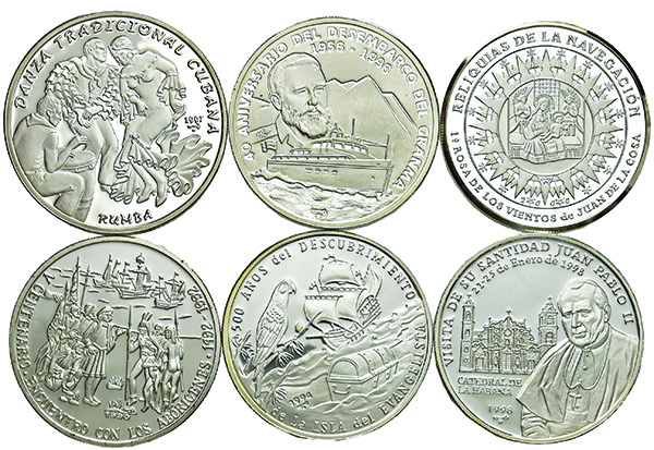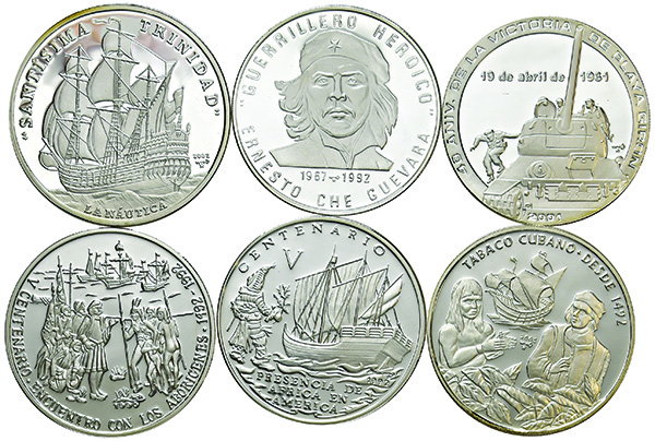 CUBA. Repubblica. Lotto di sei monete in argento commemorative da 10 pesos: 1992 (Guevara) 1992 (Centenario Americhe), 1992 (Centenario Africa), 2001 (40° anniversario Vittoria Playa Giron), 2002 (Nautica) e 2005 (Tabacco). Proof. In astucci.