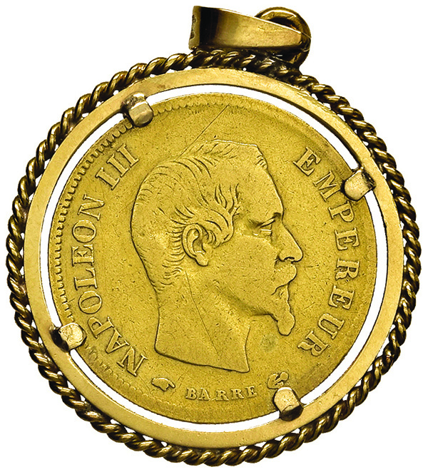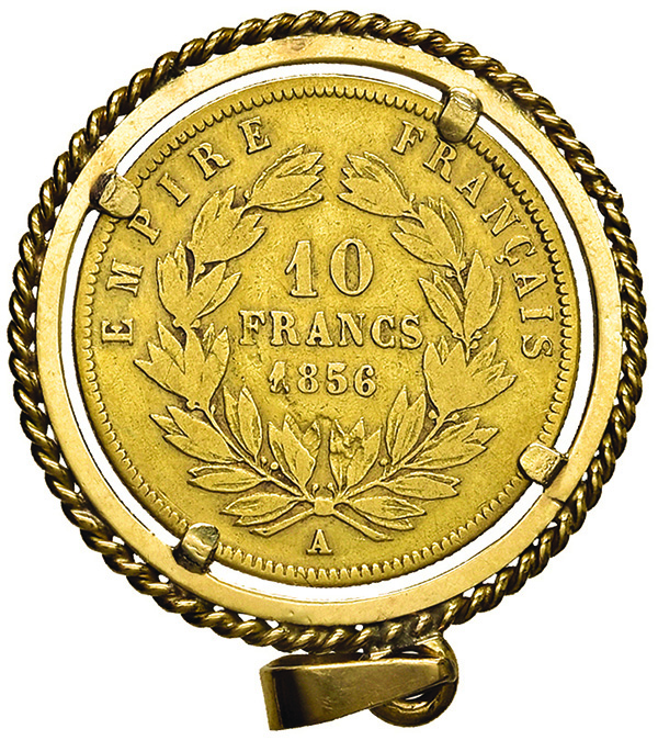 FRANCIA Napoleone III. 10 franchi 1856, incastonata in cerchietto in oro....