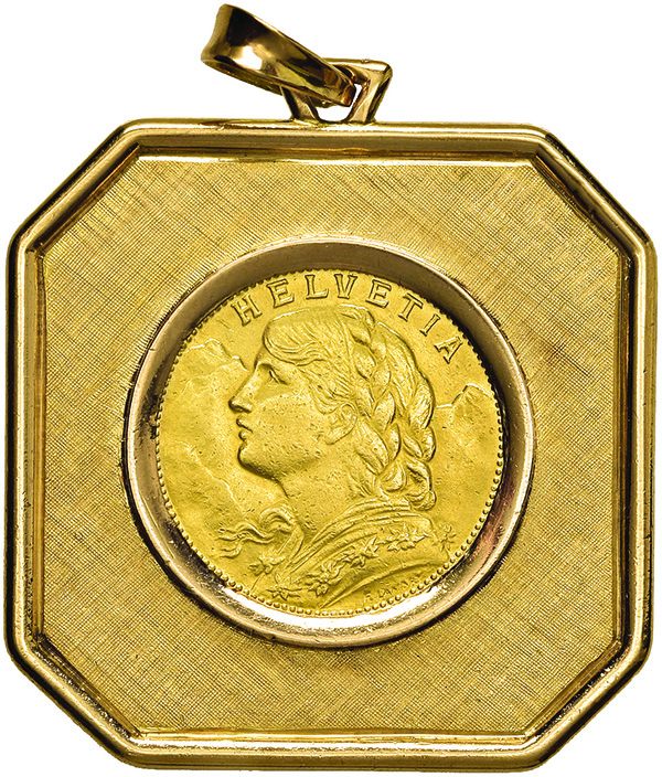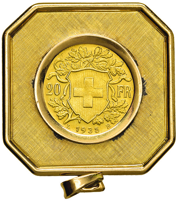 SVIZZERA Confederazione. 20 franchi 1935, tosata, incastonata in cornice in oro. Peso complessivo circa 20 gr.