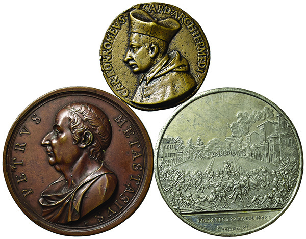 MEDAGLIE. Lotto di 3 medaglie: Carlo Borromeo, Cardinale di Milano (AE, mm 50); Pietro Metastasio (AE, mm 67); Porta Tosa, 22 marzo 1848 (metallo bianco, mm 67). Conservazioni varie.