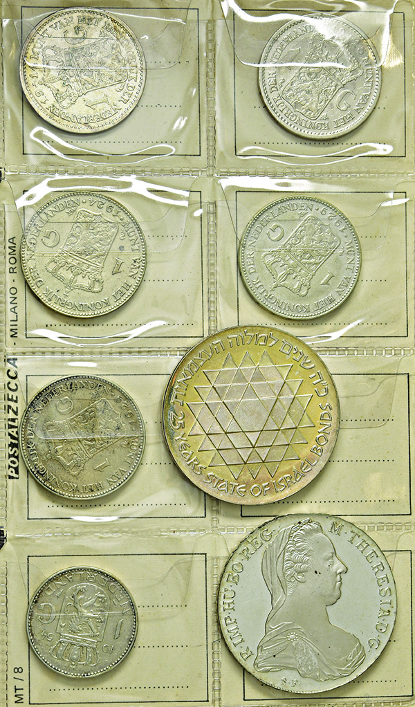 Album con 28 monete estere in argento e 10 monete italiane da 5 lire in argento, dal 1926 al 1930, "aquilotti".