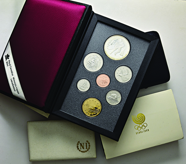 Una serie del Canada 1993 Proof in astuccio, più due coppie da 10.000 e 5.000 WON 1988 per le Olimpiadi di Seul, in astuccio, più due lingottini in argento, di cui uno a imitazione del francobollo delle Poste Vaticane 1960 per la Natività, in astuccio.