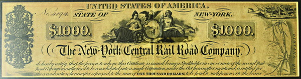 U.S.A. Titolo di credito da 1000 dollari della New York Central Rail Road...