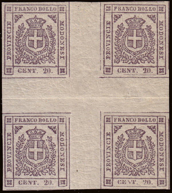 [MODENA - GOVERNO PROVVISORIO] 1859 20c. lilla grigio chiaro, blocco di 4 con interspazio verticale e orizzontale. "cuore" del foglio da 240 esemplari. Usuale piega lungo l'interspazio orizzontale. Segno di linguella solo al centro del blocco. Cert. G. Bolaffi MNH/MH..........(Sass. 16)