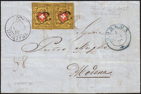 [SVIZZERA] 1850 (29 ott.) Incoming mail. Lettera spedita da Thalweil per Modena, affrancata con coppia del 10rp. nero su giallo "Rayon II", croce non inquadrata. Cover..........(Zm. 16II)