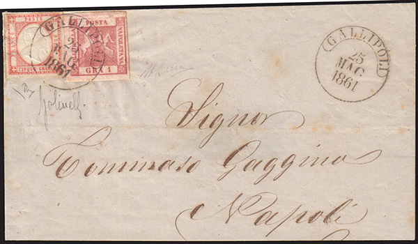 [NAPOLI/PROVINCE NAPOLETANE] 1861 (25 mag.) Lettera senza testo da Gallipoli a Napoli con affrancatura mista Napoli 1gr. rosa carminio e Province Napoletane 5gr. rosso carminio. Cert. En. Diena. Firma A. Diena, Golinelli Cover..........(Sass. 4, 21)