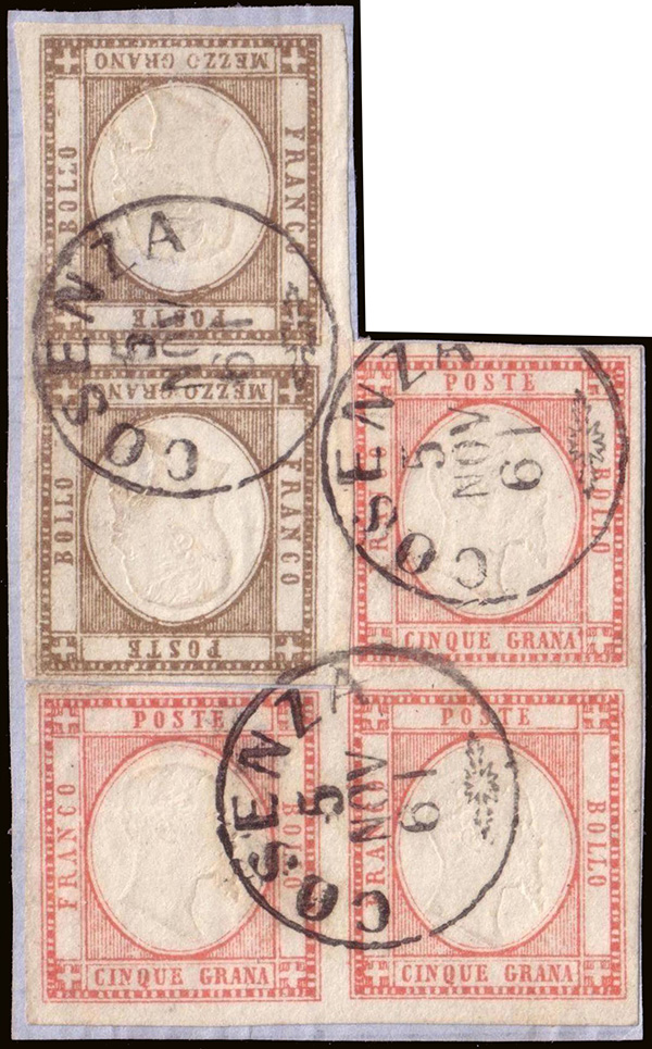 [PROVINCE NAPOLETANE] 1861 (5 nov.) Frammento di lettera affrancato con coppia del 1/2gr. bistro bruno (difettosa) e striscia di 3 a seggiola del 5gr. rosso carminio. Cert. G. Biondi, G. Chiavarello. Firma A. Diena Fragment..........(Sass. 18, 21)