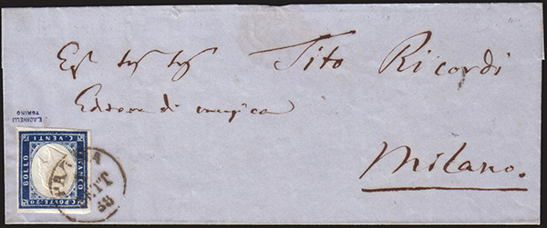 [PARMA - GOVERNO PROVVISORIO] 1859 (3 set.) Uso dei francobolli di Sardegna nel secondo periodo del Governo Provvisorio. Lettera senza testo scritta, per evidenza della calligrafia di altre missive del periodo, dal Maestro Giuseppe Verdi all'editore musicale Tito Ricordi a Milano, affrancata con 20c. azzurro scuro. Sigillo di ceralacca al verso "G V". Timbrino Asinelli Cover..........(Sass. A8)