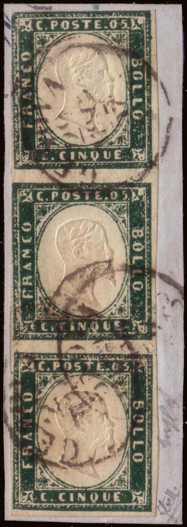 [SARDEGNA] 1857 (29 mag.) IV emissione. 5c. verde mirto scuro, strisca...