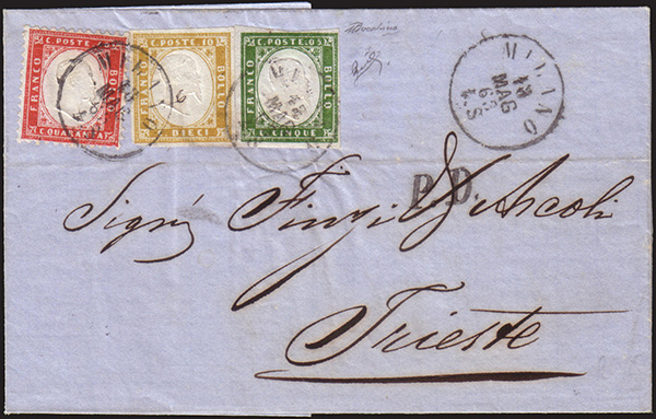 [SARDEGNA/REGNO D'ITALIA] 1863 (18 mag.) Affrancatura mista Sardegna/Regno d'Italia. Lettera con testo da Milano per Trieste affrancata con tipo Sardegna 5c. verde, 10c. bistro e Regno d'Italia 40c. rosso carminio. Cert. G. Biondi. Firma Bocchino Cover..........(Sass. 13Ea, 14E, 3)