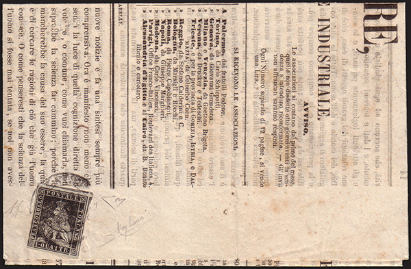 [TOSCANA] 1857 (11 gen.) Prima pagina del giornale "Lo Spettatore", spedito da Firenze, affrancato con 1q. nero su grigio. Cert. En. Diena. Firma A. Diena, L. Raybaudi Newspaper..........(Sass. 1)