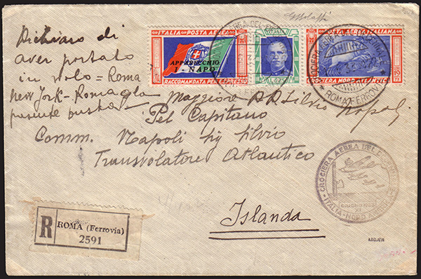 [REGNO D'ITALIA] 1933 (15 giu.) Posta aerea "Crociera del Decennale". Busta con annullo speciale della Crociera per l'Islanda con dichiarazione autografa del Capitano Silvio Napoli, affrancata con trittico I-NAPO da 5,25+19,75 lire. Cert. A. G. Bolaffi. Firma G. Bolaffi Cover..........(Sass. GP29)
