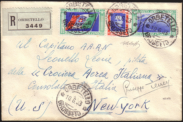 [REGNO D'ITALIA] 1933 (10 giu.) Posta aerea "Crociera del Decennale". Busta da Orbetello per New York, firmata dal Capitano Giuseppe Teucci, affrancata con trittico I-TEUC da 5,25+44,75 lire. Cert. A. G. Bolaffi. Firma G. Bolaffi Cover..........(Sass. GP40)