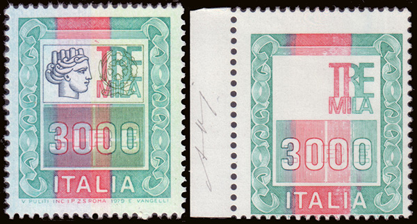 [REPUBBLICA] 1979 Varietà, 3000 lire "Alti valori", francobollo naturale...
