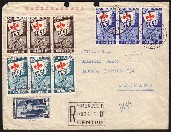 [REPUBBLICA] 1951 (7 giu.) Busta raccomandata affrancata con 3 serie, in strisce, dei "Giochi Ginnici", più 15 lire "Italia al Lavoro" spedita da Firenze a Bergamo (8 giu.). 1 es. della striscia di 3 da 15 lire difettoso nell'angolo superiore sinistro. Cert. Fiecchi Cover..........(Sass. 641, 661/663)