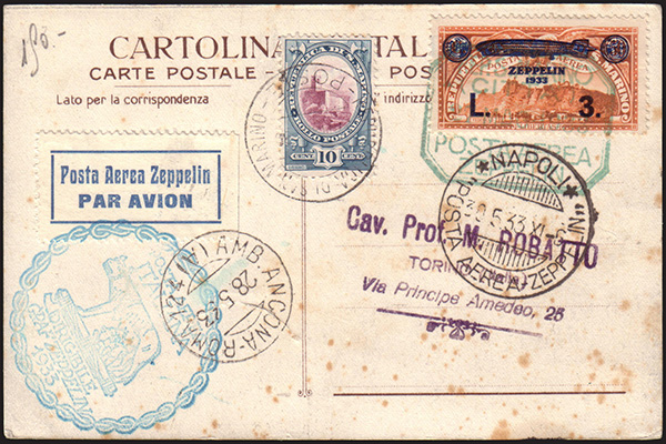 [SAN MARINO] 1933 (27 mag.) Crociera Zeppelin, lancio su Napoli. Cartolina spedita da "Città" per Torino, affrancata con francobollo speciale da 3 lire + 10c. ordinario, timbro tondo con Lupa della Crociera e annullo speciale di transito "* NAPOLI * "POSTA AEREA - ZEPPELIN" 30 5 33 XI -6". Da esaminare. Postcard..........(Longhi 599)