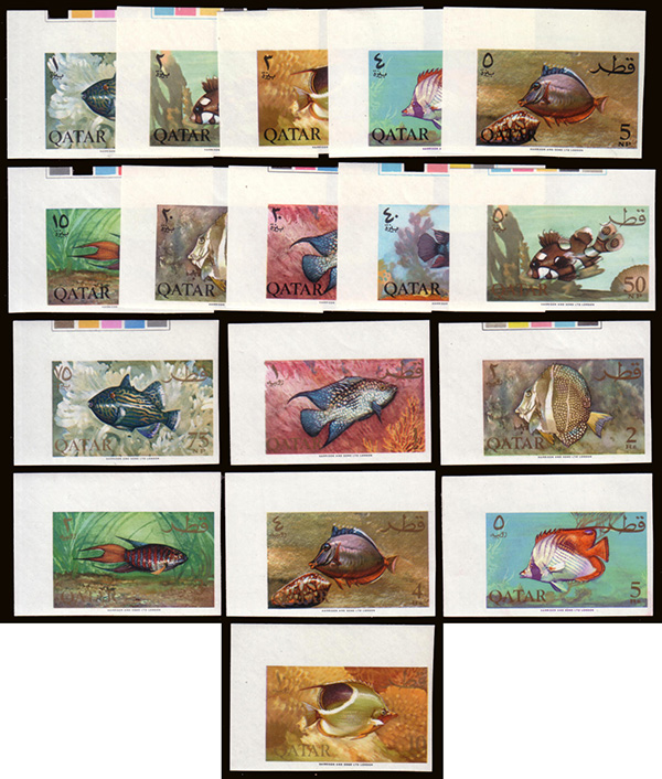 [QATAR] 1965 "Pesci", serie completa non dentellata di 17 valori, angolo di...
